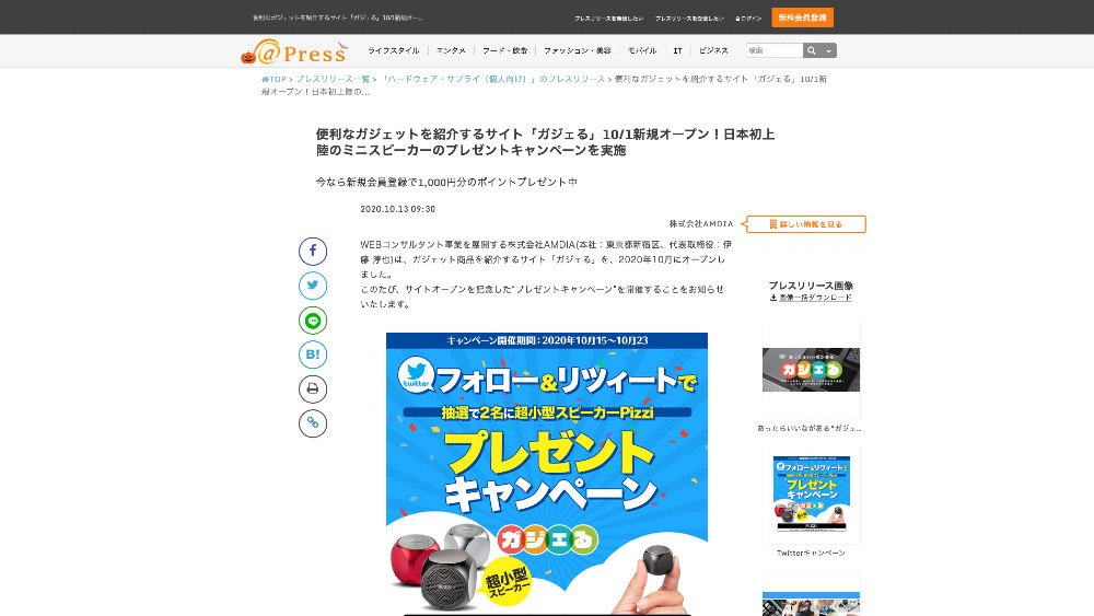 プレスリリース「便利なガジェットを紹介するサイト「ガジェる」10/1新規オープン! 日本初上陸のミニスピーカーのプレゼントキャンペーンを実施」を配信いたしました。 News この記事が気に入ったら いいねしてね! URLをコピーしました!